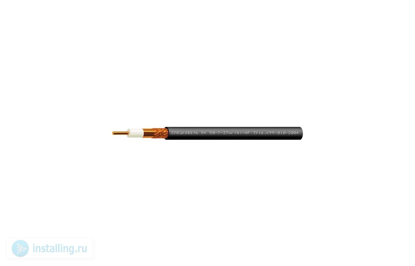 Внутренний проводник: медный однопроволочный диаметром 2,62 мм; Наружный размер кабелей, DH, не более 10,3 мм; Изоляция: полиэтилен физического вспенивания диаметр по изоляции 7,25 мм ; Внешний проводник: оплетка плотностью 50–60из медных луженых проволок диаметром 0,15 мм, наложенная поверх ламинированной алюминиевой фольги диаметр по внешнему проводнику 7,25 мм ; t-раб.–60...+85°С; Оболочка: полимерная композиция, не содержащая галогенов; Цвет: черный