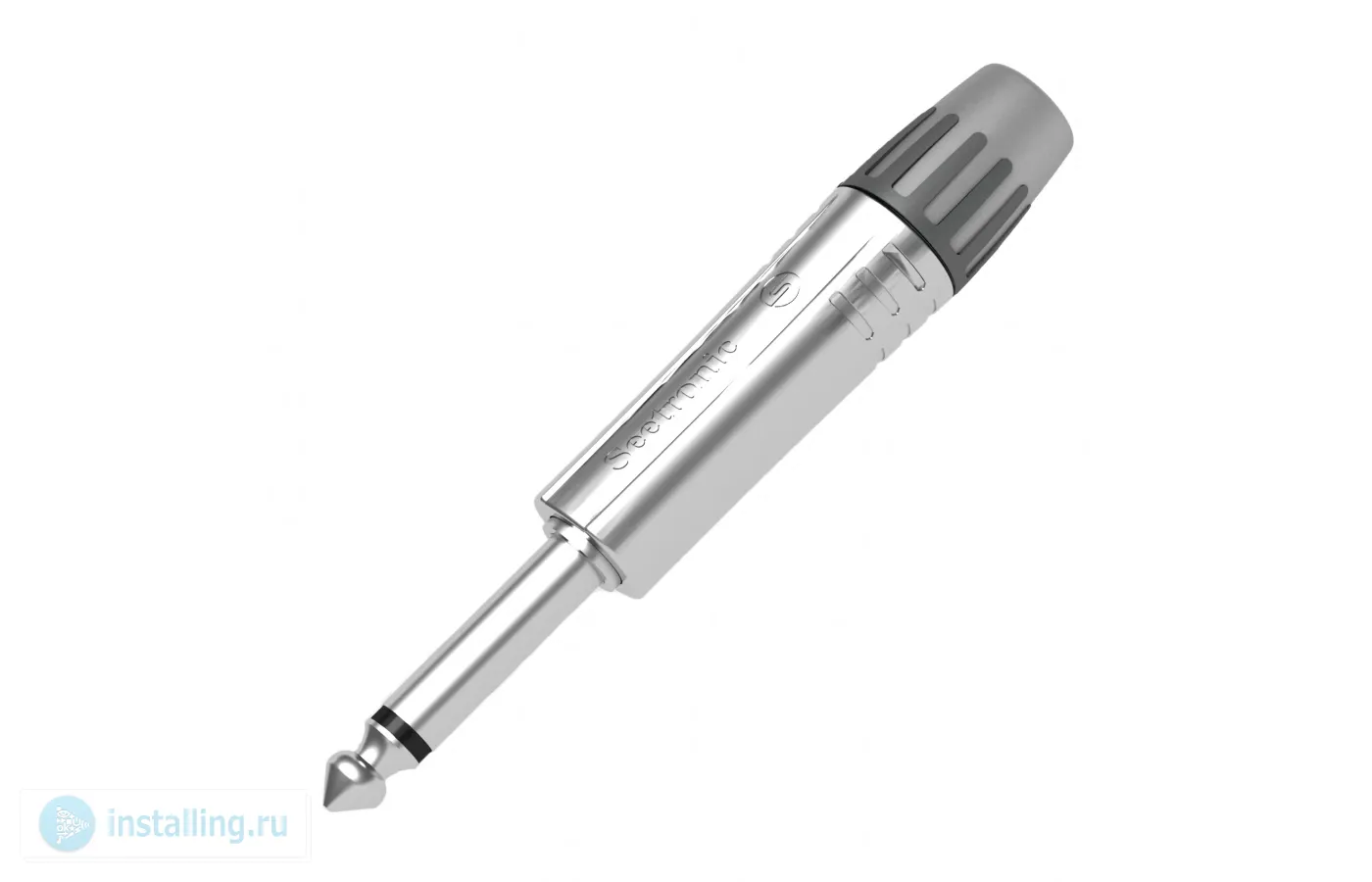Разъём моно JACK 1/4” (6.35 мм). Характеристики: моно / несбалансированный, цанга для снятия натяжения, серебряный корпус, черная опорная втулка, серебряные контакты, пайка контактов
