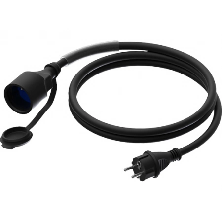 CAB465/15-F – силовой удлинитель 15 м, розетка с крышкой, 3х2,5 мм?, Франция. Включает кабельную розетку типа E, силовой трехжильный кабель H07RN-F3G2.5 с неопреновой оболочкой диаметром 11 мм и длиной 15 м, прямую вилку типа E (Франция). Розетка типа E (Франция) имеет два круглых контакта диаметром 4,8 мм, расположенных на расстоянии 19 мм друг от друга (правый контакт нейтральный, левый – фаза) и заземленный контакт, выступающий из верхней части розетки. Этот тип используется во Франции, в Бельгии, Польше, Чешской Республике, Словакии и Дании. Часто этот тип называется Schuko/Шуко, от немецкого schutzkontakt, что означает «защищенный», или «заземленный» контакт. Несмотря на то, что стандарт предусматривает использование контактов диаметром 4,8 мм, отечественные вилки (по ГОСТ 739), соответствующие евророзетке (Europlug), с контактами диаметром 4 мм и расстоянием 19 мм между ними легко подходят к французским розеткам. Жилы кабеля многопроволочные (48x0,254 мм) витые в ПВХ-оболочке, очень гибкие, имеют низкое сопротивление (0,66 Ом/100 м) и расчитаны на ток до 20 А. Оболочка кабеля из искусственной резины – неопрена – устойчива к УФ, кислотам, нефтепродуктам и не содержит галогены. Износостойкая прочная и очень гибкая оболочка, поддерживающая диапазон температур от -40° до 90°, позволяет использовать удлинитель в любых климатических условиях как внутри, так и вне помещений. Кабель дополнительно оснащен крышкой для розетки и прозрачной пластиковой трубкой для защиты кабеля от перегибов и изломов. Цвет – черный.