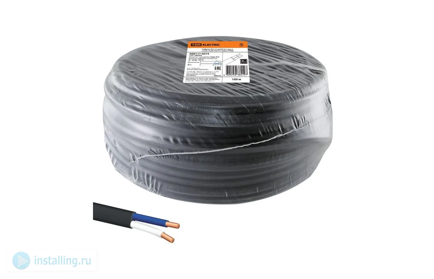 Оболочка ПВХ-пластикат; 2 медные однопроволочные жилы сечением 2,5 мм?,внеш.размер 5.63х8.66 мм, U-ном. 0,66 кВ; t-монт. не ниже -15°С, t-раб. -50...+50°С; бухта 100м, масса 9.91 кг