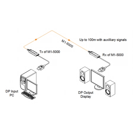 M1-5000 – оптоволоконный гибридный кабель для передачи сигналов интерфейса DisplayPort. Кабель содержит четыре оптических и пять экранированных медных жил, заключенных в общую негорючую ПВХ-оболочку. На концах кабеля установлены миниатюрные модули, выполняющие преобразование сигналов интерфейса DisplayPort для передачи и приема по оптоволоконной линии. Данные каналов интерфейса передаются по четырем многомодовым оптоволоконным жилам, обеспечивающим пропускную способность до 2,7 Гбит/с на канал. Таким образом, обеспечивается передача сигналов компьютерной графики с разрешением до 2560x1600 с частотой обновления 60 Гц и 36-разрядной глубиной кодирования цвета. Сигналы сервисного канала передаются по медным проводникам, обеспечивая поддержку VESA-спецификаций для EDID и MCCS-стандартов. Кабели M1-5000 с поддержкой передачи данных сервисного канала выпускаются в ассортименте длин от 10 до 100 м, другие варианты доступны под заказ.