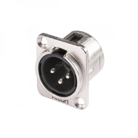 HI-X3DM – панельный разъем XLR 3-pin (вилка), с фланцем типа D. Контакты под пайку, прямые, никелированные. Цвет корпуса серебристый.