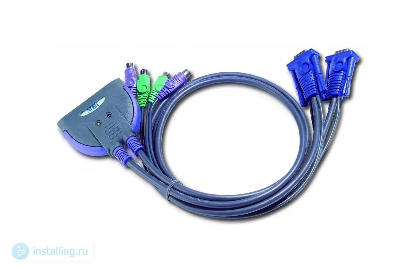 VGA/SVGA+KBD+MOUSE, 1>; 2 блока/порта/port PS2, со встр. KVM-шнурами PS/2 2x1.2м, KVM=монитор+клав.+мышь;консоль упр. - PS/2;KVM-121 , 0…+50 °C, 73 x 62 x 22 мм.