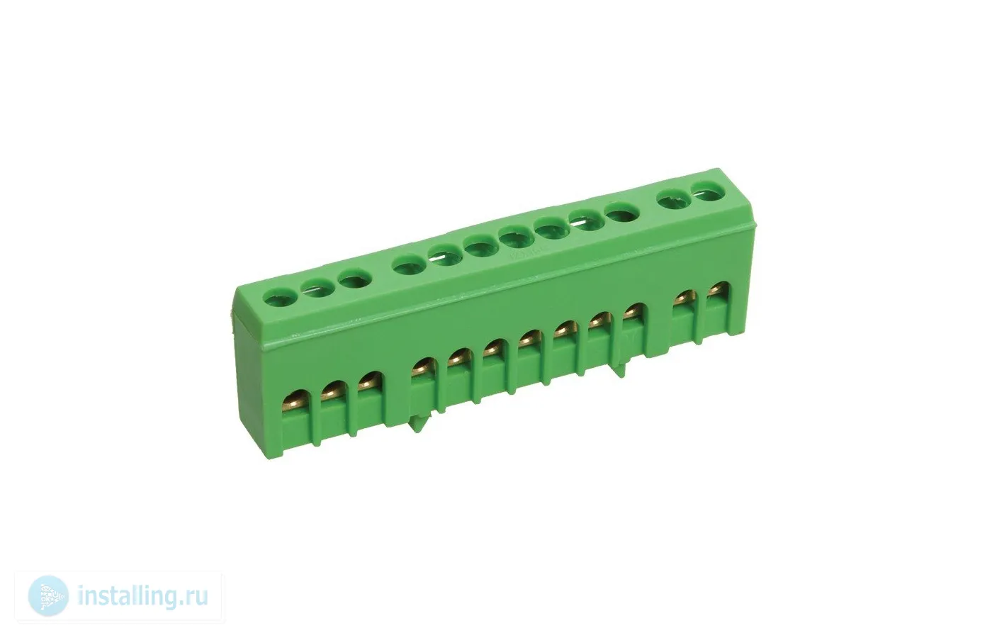 12 контактов, I-нагр. 100 А, t-раб. -40 ... +50 °С, габ.размеры 13,5х31х88 мм, материал латунь, цвет зеленый