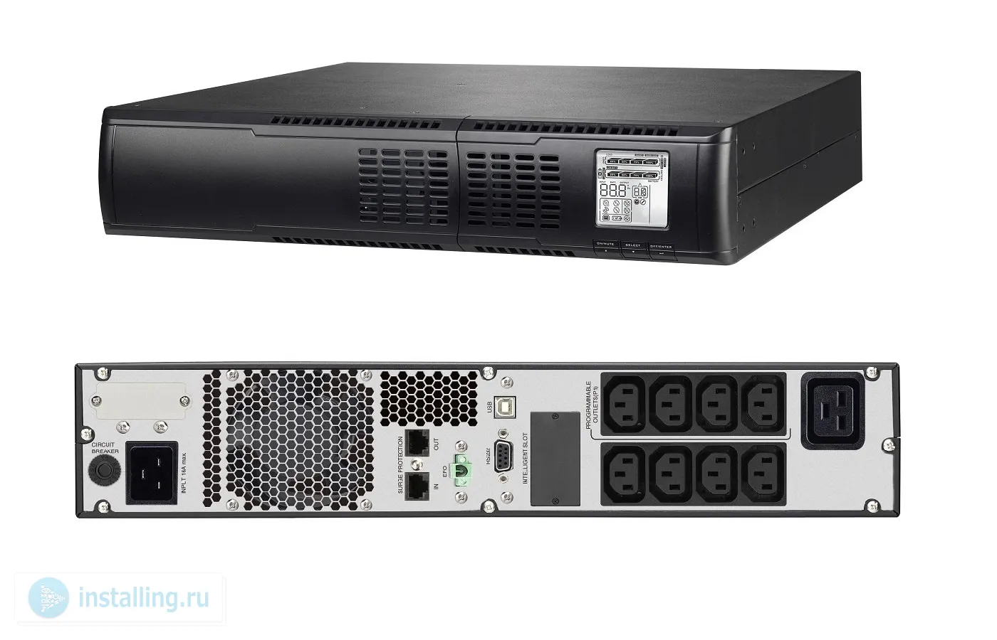 Line-Interactive, модифицированная синусоида; P-нагр.3000 ВА/2700 Вт; U-вх.162…290 В; 6 АКБ 12 В 9 А·ч; LCD дисплей, SNMP карта, USB, RS232; выход 8xIEC320 C13, 1xIEC320 C19; защита от перезаряда, перенапряжения, короткого замыкания; t-раб.0…+40°C, 438х88х630 мм.