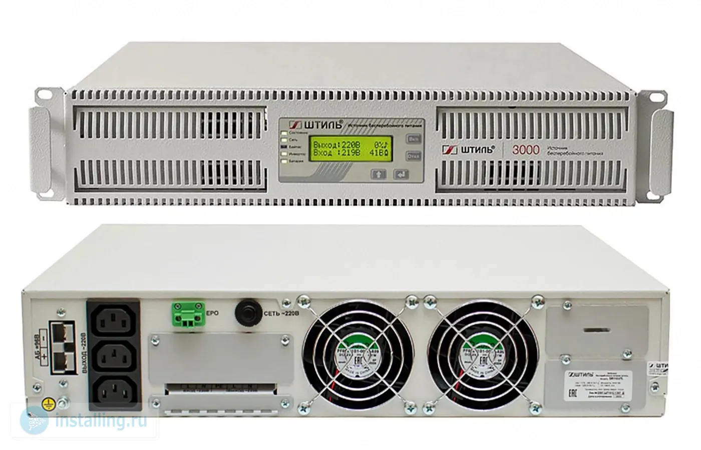 On-line (с двойным преобразованием), чистая синусоида, 3000 ВA (2700 Вт); U-вх.220 В; под внешние аккумуляторы, U-акб.96 В, I-заряд.4 А; ЖК-дисплей; выходные разъёмы - IEC-320-C13 (3 шт.); холодный старт, совместим с генератором; высота 2U; IP20, t-раб.+5...+40°C, 88х466х440 мм