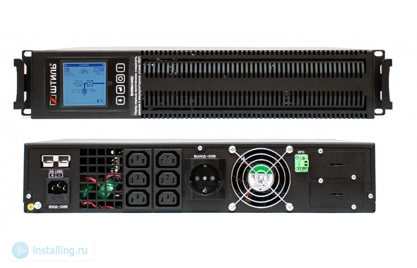 В стойку, on-line (с двойным преобразованием), чистая синусоида, 1000 ВA (900 Вт); U-вх.220 В; под внешние аккумуляторы, U-акб.36 В, I-заряд.5 А; ЖК-дисплей; выходные разъёмы - IEC-320-C13 (6 шт.), EURO с заземлением (1 шт.); холодный старт, совместим с генератором; высота 2U; IP20, t-раб.+5...+40°C, 88х482х401 мм