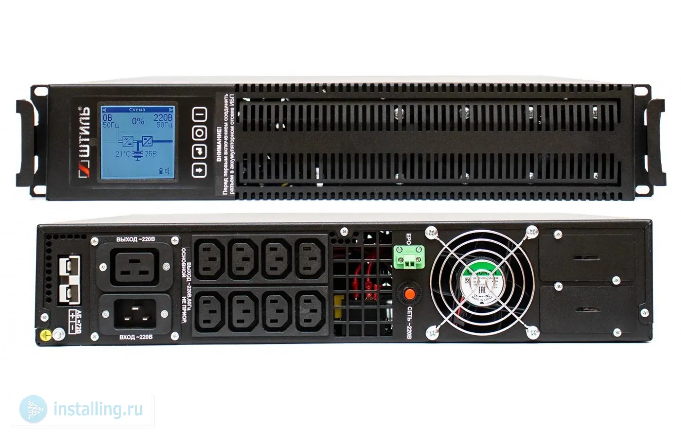 В стойку, on-line (с двойным преобразованием), чистая синусоида, 3000 ВA (2700 Вт); U-вх.220 В; U-акб.72 В, I-заряд.1 А, 6 батарей 12 В 9 А·ч; ЖК-дисплей; выходные разъёмы - IEC-320-C13 (8 шт.), IEC-320-C19 (1 шт.); холодный старт, совместим с генератором; высота 2U; IP20, t-раб.+5...+40°C, 88х482х595 мм