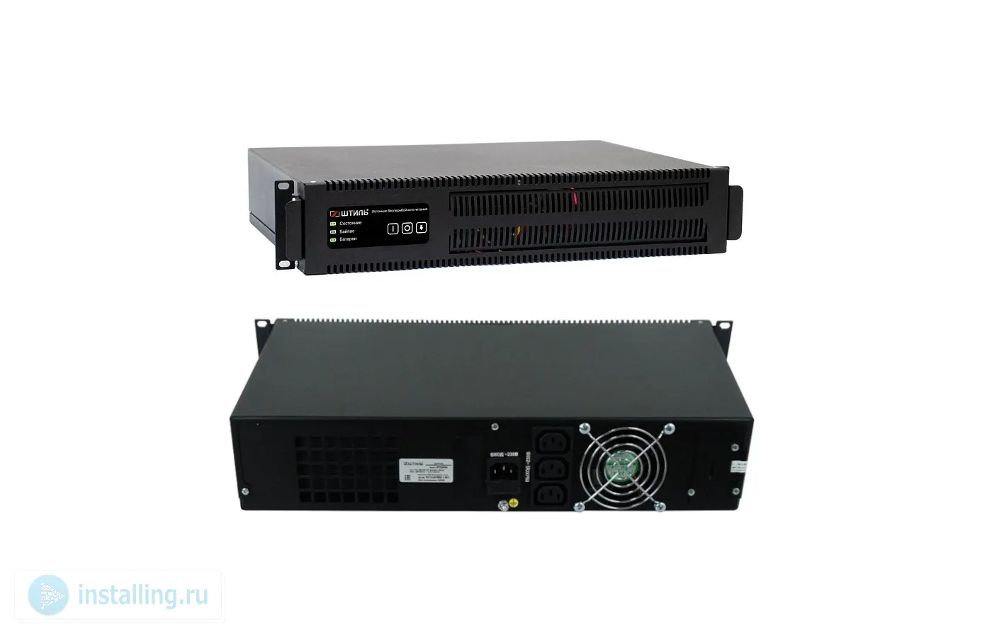 В стойку, on-line (с двойным преобразованием), чистая синусоида, 300 ВA (225 Вт); U-вх.220 В; встроенные аккумуляторы, 3х12В/9Ач, U-акб.12 В, I-заряд.3 А; светодиодные индикаторы, "холодный старт"; выходные разъёмы - IEC-320-C13 (3 шт.), EURO F-type с заземлением (1 шт.); высота 2U; IP20, t-раб.+5...+40°C, 89х440х350 мм