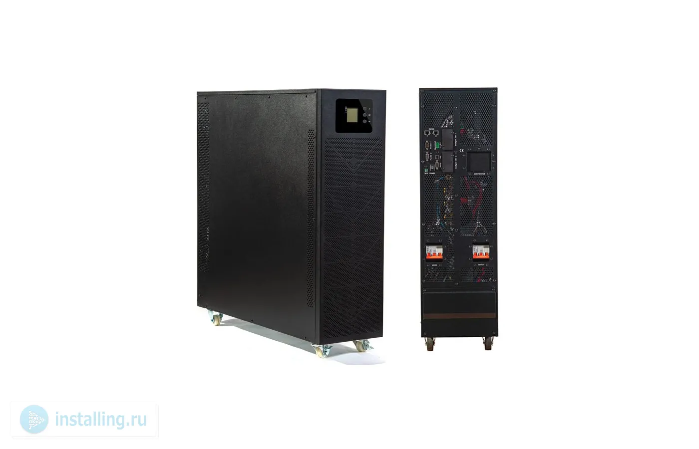 Трёхфазный online; U-вх.380 В, возможность питания от генератора, U-вых.380 В, P-вых.10000 ВА 9000 Вт ; необходимое количество батарей 16/18/20, АКБ 12 В/40 Ач; световая и звуковая индикация режимов работы, ЖК-дисплей; RS 232, USB, 2 порта для платы релейного интерфейса или SNMP-модуля, коммуникационный порт типа СК; функция удаленного аварийного отключения выходного напряжения EPO ; параллельная работа до 4-х устройств; IP20, t-раб.0...+40°С, 250х608х655 мм