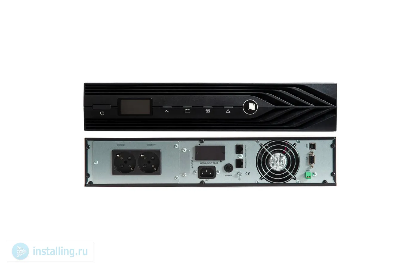 220 В, 1500ВА 1350 Вт , Online, синусоидальная форма выходного напряжения, световая и звуковая индикация режимов работы, необходимое количество АКБ для работы 3 шт, ёмкостью 40 -120 Ач, ток заряда АКБ 6 А; разъемы 2 шт. CEE 7/4 розетка с заземлением, разъем питания IEC C14; дистанционный мониторинг по RS 232, USB, порт для платы релейного интерфейса, возможность подключения SNMP-модуля DL 801, функция удаленного аварийного отключения выходного напряжения EPO ; корпус под 19 шкаф, высота 2U или настольная установка, U-вх. 160… 290В, IP20, 0…+40°С, 40х86.5х430 мм.