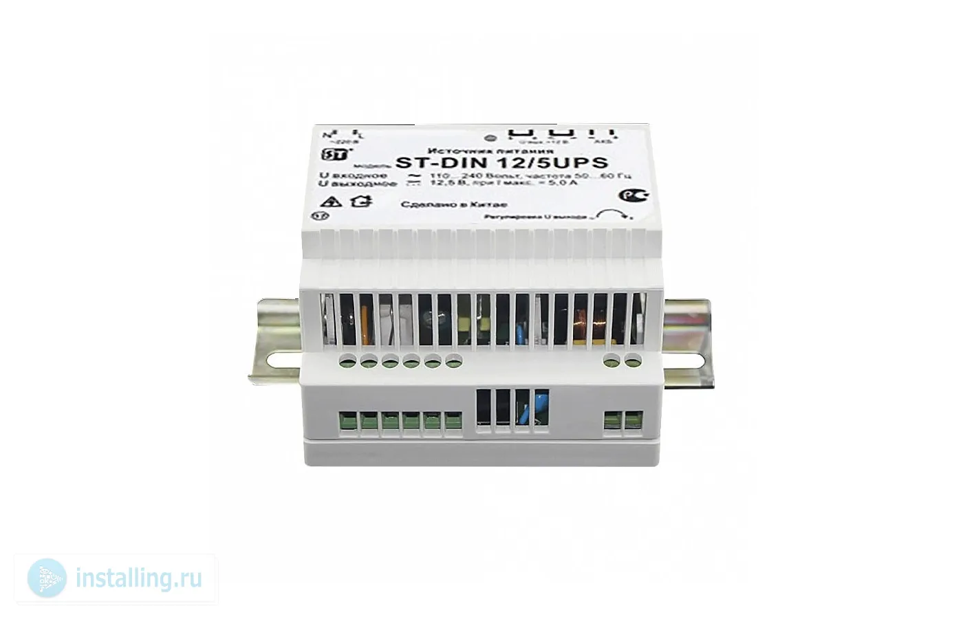 С креплением на DIN рейку; U-вх.220 В, U-вых.11.2…14.2 В (регулируется), I-вых.5 А; под внешний АКБ 12 7 или 12 А·ч; защита от короткого замыкания, защита АКБ; t-раб.-10…+45°С, 92х87х54.5 мм