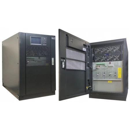On-Line, чистая синусоида; P-нагр.60кВА/54кВт, Вход:380В, AVR:304...478В, U-вых.380/400/415В±1, Внешние АКБ не входят в комплект , U-шина ±240480В , I-зар.22.5А; выходные разъемы Клеммная колодка, Сенсорный LCD-дисплей, SNMP-слот, IP20, t-раб.0...+40°С, 978х600х950 мм. Напольный