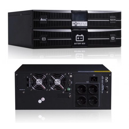 On-Line для установки в 19 шкаф, высота 2U, чистая синусоида; P-нагр.3кВА/2.7кВт, U-вх.220В, AVR:110...288В, U-вых.200/208/220/230/240В±1 , АКБ 8х12В/9Ач, Возм.подкл.внешних АКБ/Блоков до 3-х блоков , U-шина 96В, I-зар.1А; выходные разъемы 2хSchuko CEE7/4, LCD-дисплей, SNMP-карта DY802, USB, RS-232; IP20, t-раб.0...+40°С, 440х173х490 мм
