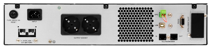 220В On-Line, синусоидальная форма выходного напряжения; P-вых.1000 ВА (900 Вт), U-вх.176…280 В, U-вых.208/220/230/240 В (устанавливается пользователем), внешниеАКБ 12 В 2 шт. 40…150 Ач; 2 х Schuko; световая и звуковая индикация режимов работы, ЖК дисплей;RS-232, USB, EPO (удаленное аварийное отключение выходного напряжения), возможность установки карты сухих контактов или SNMP модуля; IP20, t-раб.0...+40С, 440х468х88 мм. Корпус высотой 2U для установки в 19" шкаф. В комплекте кабель питания, USB кабель тип А-В, две подставки для вертикальной установки.