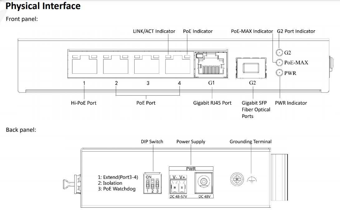 Сетевой РоЕ коммутатор 6 портовый неуправляемый; 3 RJ45 100M PoE с грозозащитой 6кВ; ,1 100Mпорт поддерживает HiPoE 60Вт,1 1000М SFP порт, 1 RJ45 1000M Ethernet ; бюджет PoE 60Вт;поддержка режима передачи до 300м, таблица MAC адресов на 2000 записей; пропускная способность 4.8Гб/с; DC 48-57 V, 1.35 A; -30°C...+65°C.