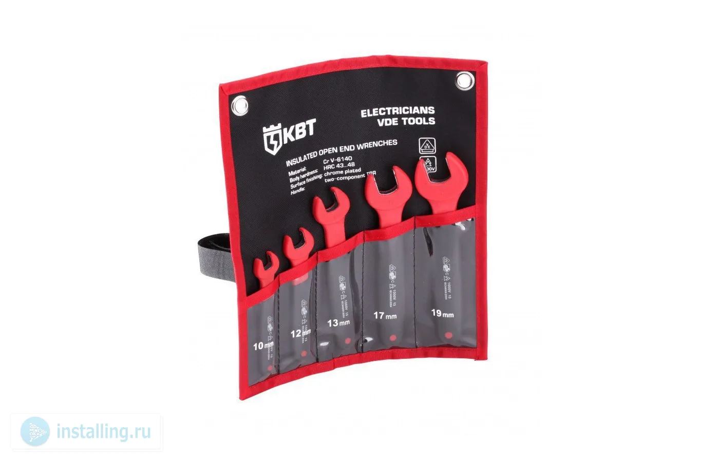 Набор однорожковых диэлектрических ключей, 5 ключей 10, 12, 13, 17, 19 мм для работы под напряжением до 1000 В, раскладная сумка с ремнем-липучкой и крепежными отверстиями, вес 560 г