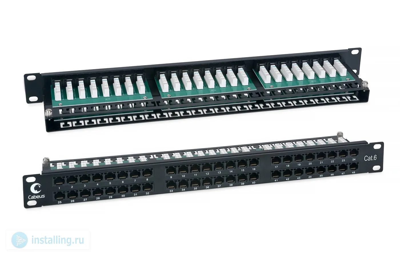 Неэкранированная патч-панель выполнена в 19” формате и предназначена для установки в телекоммуникационные шкафы и стойки. Соответствует характеристикам категории 6. Имеет 48 портов RJ-45 на 1U.