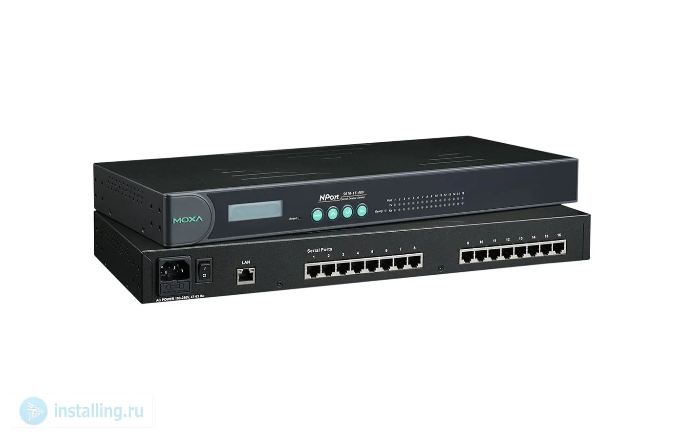 Последовательных с LCD экраном; 16 портов ввода-вывода RS-232/422/485 16хRJ-45 , до 921600 Бит/сек; 1 х Ethernet RJ-45 ; U-пит.100...240 В, P-потр.24.48 Вт; t-раб.0...+55°С, 440 х 45 х 198 мм 1U . Монтаж в стойку 19.