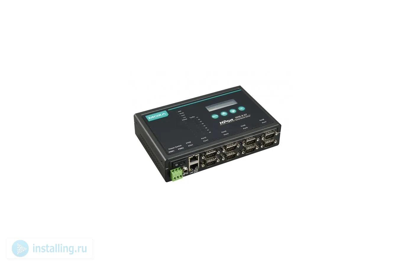 Последовательных интерфейсов; 8 портов ввода-вывода RS-232/422/485 8хDB9M , до 921600 Бит/сек, гальваническая изоляция до 2 кВ; 2 х Ethernet RJ-45 , 2 IP-адреса;U-пит.12...48 В, I-потр.200 мА 48 В ; t-раб.0...+55°С, 197 х 44 х 125 мм. Монтаж на DIN-рейку, на стену, на стол. Адаптер питания в комплекте.