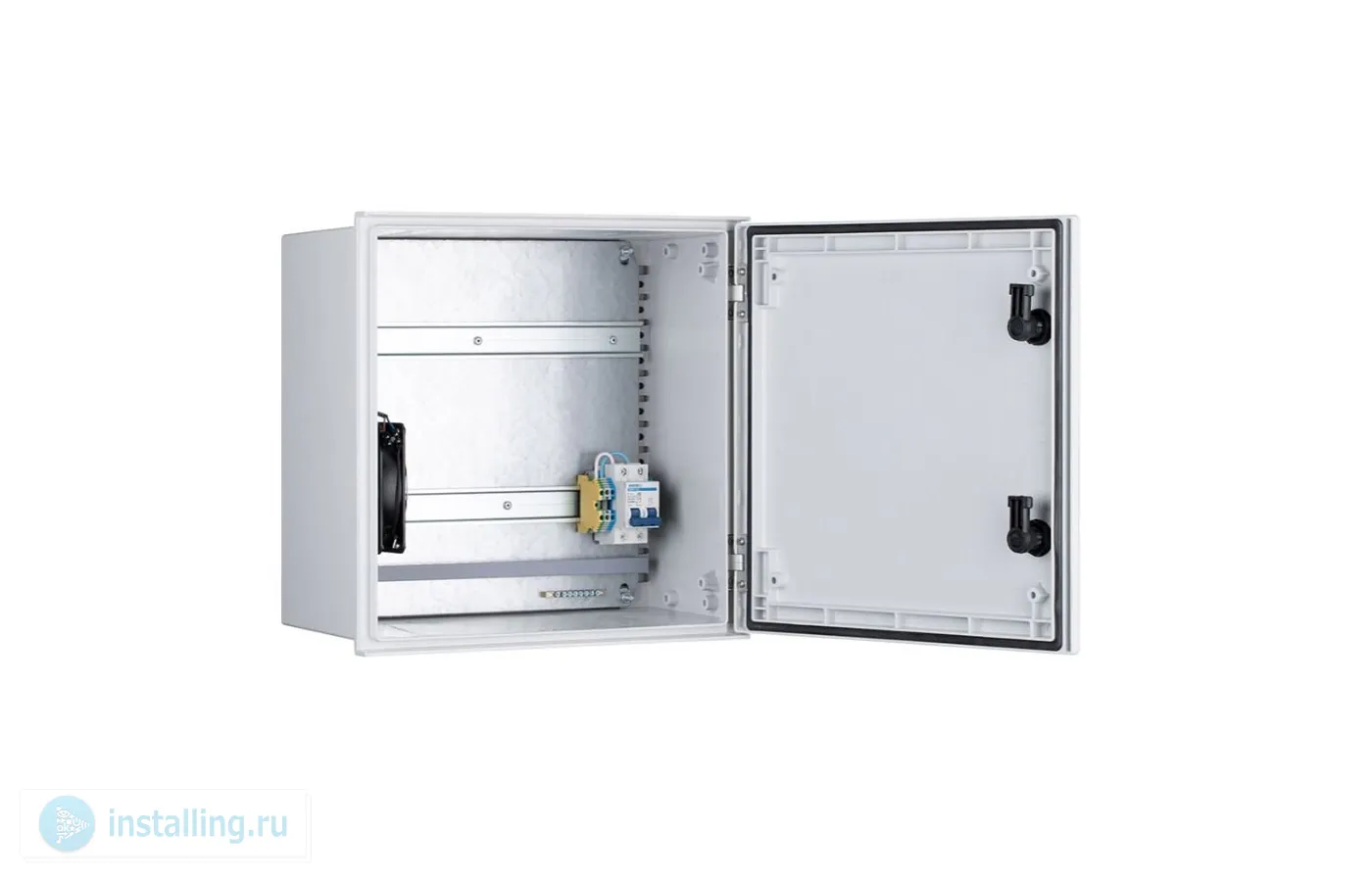 Всепогодный из армированного стекловолокном полиэстера, с монтажной панелью с DIN-рейками для клиентского оборудования, комплект [1] с вентилятором ; U-пит.100...240В; IP66, t-раб.-40...+60°С, 400x400x200 мм. В комплекте гермовводы, проходные клеммы, двухполюсный автомат 10 А , шина заземления, вентилятор с термостатом.