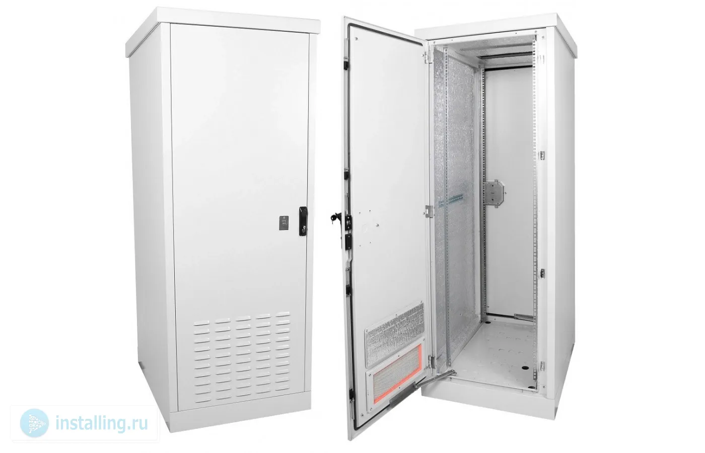 Шкаф изготовлен из листовой стали толщиной до 2мм., внутри покрыт термоизоляционным материалом. В комплект поставки входит утеплитель, который необходимо наклеить на основание внутри каркаса после прокладки проводов. В крыше каркаса и на передней двери предусмотрены вентиляционные окна, которые могут быть закрыты заглушками либо в них могут быть установлены фильтры и вентиляторы серии R-FAN. Двери выполнены из стали 2мм, могут быть перевешены для изменения стороны открытия.