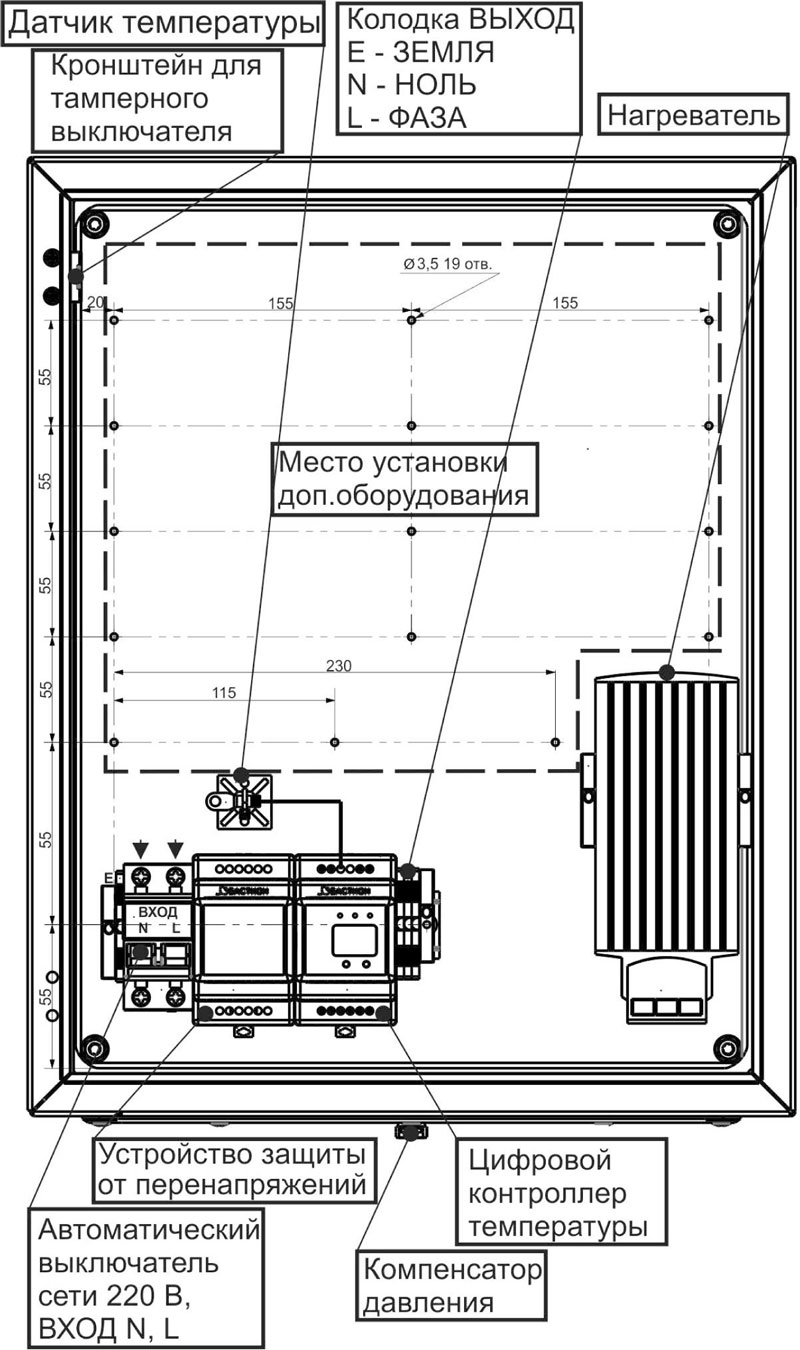 С автоматикой управления климатом; U-пит.170...250В, I-нагр.5 А, P-нагрев.60 В; выход АВАРИЯ; IP65, t-раб.-45...+50С, 400х510х260 мм, 13.3 кг.