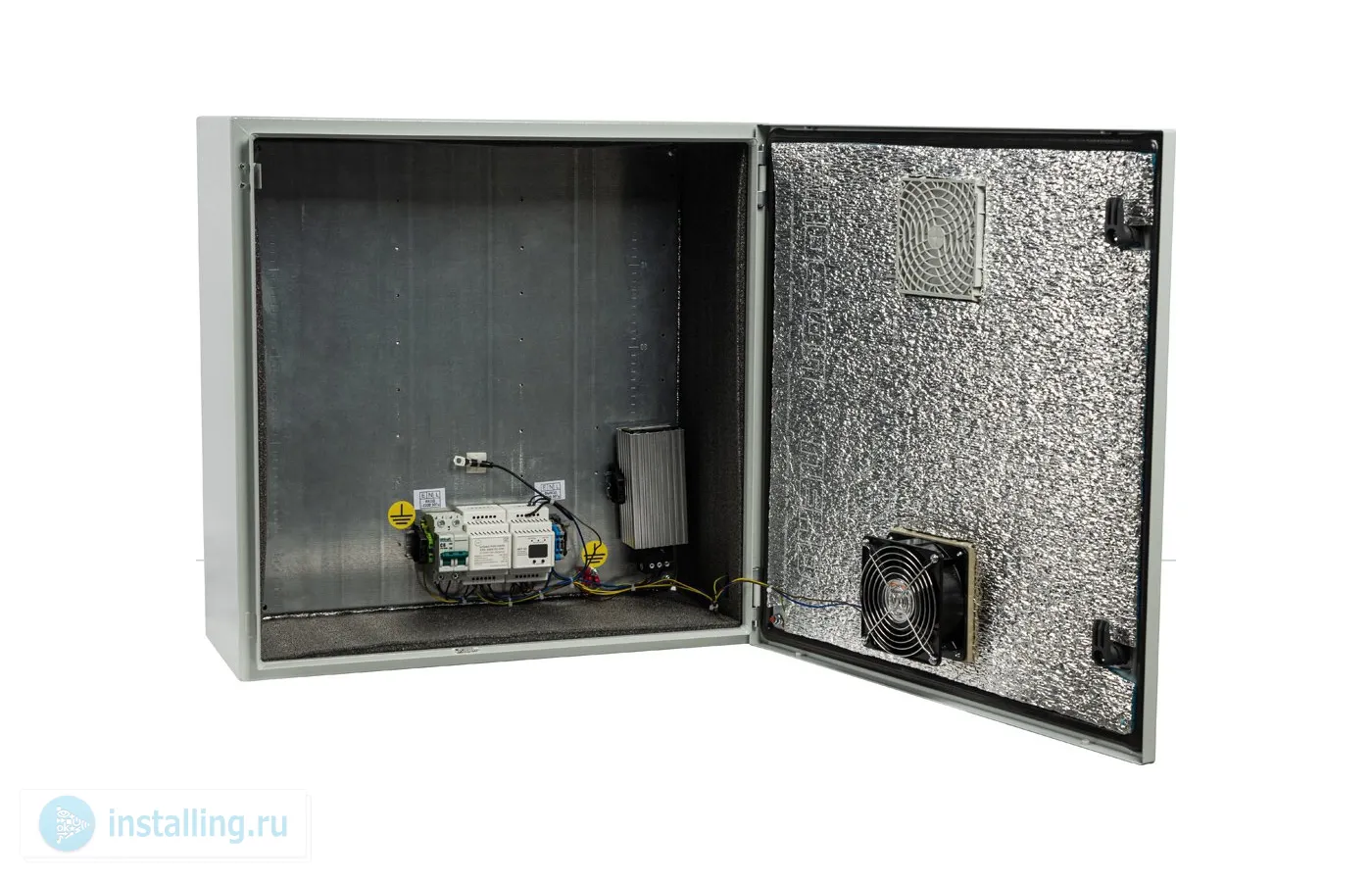 Шкаф металлический уличный утепленный с обогревом и вентиляцией; встроенный цифровой контроллер ЦКТ-01, термодатчика DS18B20; U-пит.170...250В, I-нагр.5 А, P-нагрев.100 В, вентилятор производительностью 55 кум.м/ч; выход АВАРИЯ; IP55, t-раб.-65...+50С, 600х600х250 мм, 21 кг.