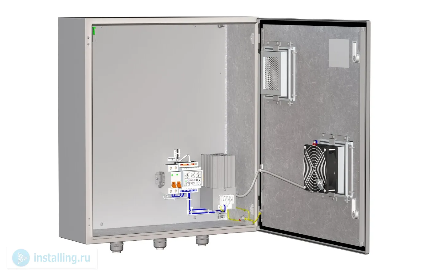 Термошкаф с вентилятором; AC 220 В; I-нагр.6 Аmax; P-потр.118 Вт обогрев; P-потр.18 Вт вентилятор; IP55; -40...+50°С; 600х600х210 мм. В комплекте: блок управления климатом БУК-5, обогреватель шкафов ОТШ-100, блок управления климатом БУК-5В, вентилятор, тампер.