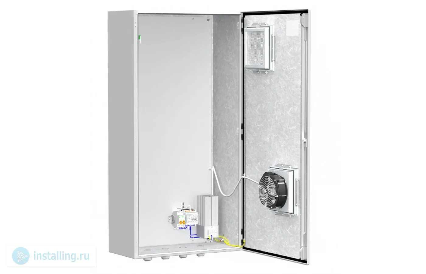 Термошкаф с вентилятором; AC 220 В; I-нагр.6 Аmax; P-потр.218 Вт обогрев; P-потр.18 Вт вентилятор; IP55; -40...+50°С; 1200х600х300 мм. В комплекте: блок управления климатом БУК-5, обогреватель шкафов ОТШ-200, блок управления климатом БУК-5В, вентилятор, тампер.