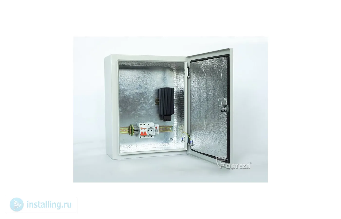 Металлический шкаф с обогревателем 100 Вт, U-пит.220В, t-рег.0…+60°С, IP66, t-раб.-60…+50°С, 400х500х230 мм. В комплекте: монтажная панель 360х420 мм, замок на дверце, автомат 16А, розетка, клеммные колодки, регулятор температуры.