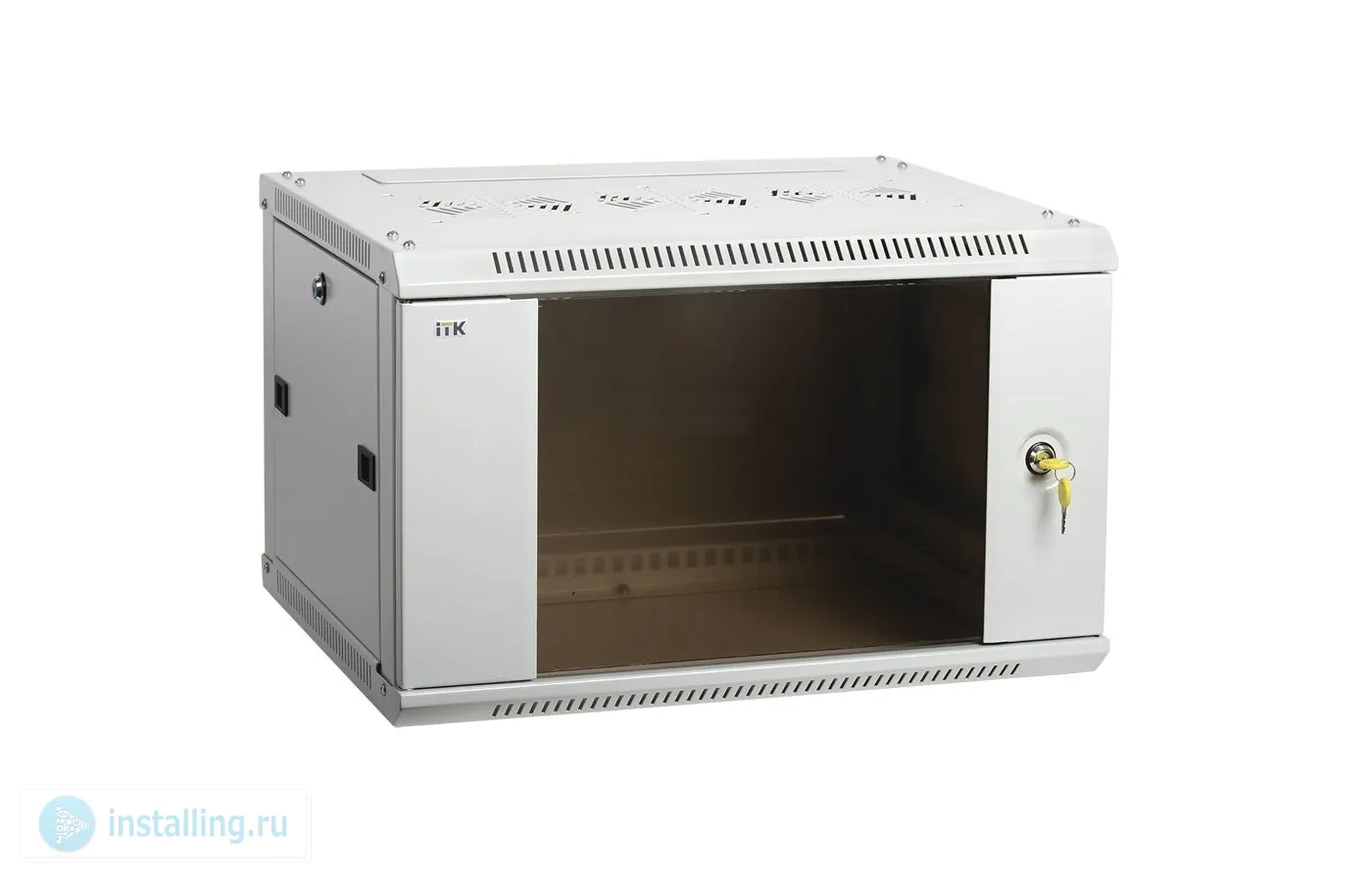 Шкаф настенный 19, 9U, полезная глубина 500 мм, 500x600х600 мм ВхШхГ. Допустимая нагрузка 90 кг. Дверь обзорная с ударопрочным тонированным стеклом. Цвет серый RAL7035. Разобранный.