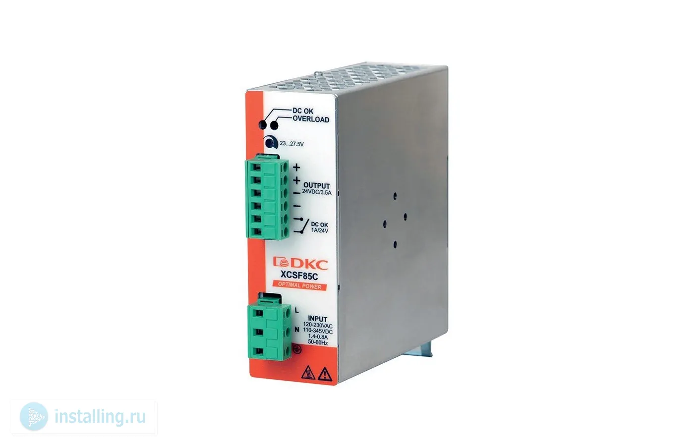 С креплением на DIN рейку; U-вх. 90...264 В 50 Гц , U-вх. =100...345 В, I-потр.1.6 А; U-вых.пост. 24 ± 1 регул. 23...27,5 В , I-вых.пост. ном. 3.5 А; свет.индикатор DC OK/ALARM, выход СК Авария 24В/1А; IP20, t-раб. -20...+60°C, габ.размеры 40х130х115 мм. Встроенный ORing диод для параллельного подключения с резервированием