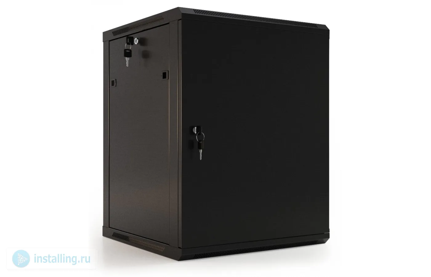 Шкаф настенный 19, 12U, полезная глубина 425 мм, допустимая статическая нагрузка 40 кг, IP20, 650x600х600 мм ВхШхГ. Передняя дверь металлическая сплошная в комплекте с замком. Цвет черный RAL 9004. Разобранный.