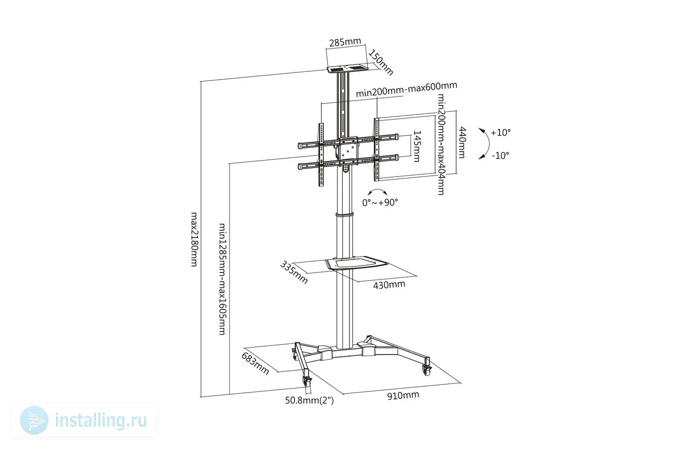 Мобильная для ТВ 37"-70" до 50 кг, VESA до 600x400мм, наклон -10°/+10°, регулировка высоты ТВ, полки для камеры и источников, поворот в портретное положение (90°)