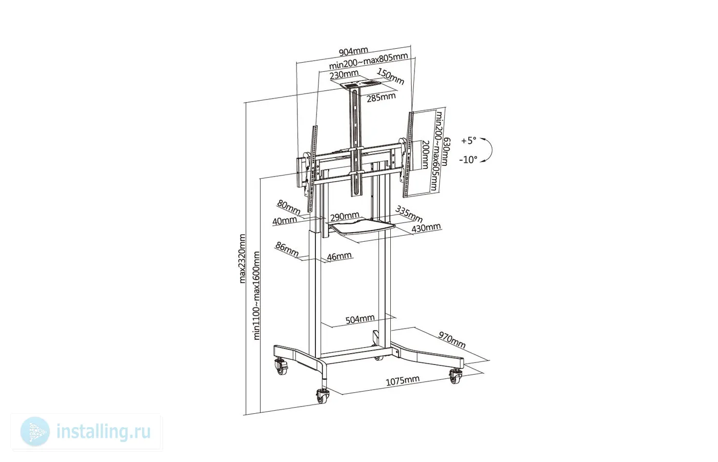 50"-100" до 120 кг, VESA до 800x600 мм, наклон -10°/+5°, регулировка высоты 1100-1600 мм до центра ТВ, пульт ДУ в комплекте