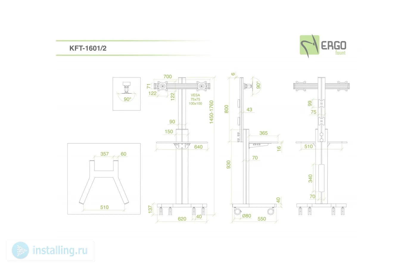 KFT 1601/2 Silver – напольная мобильная стойка для двух мониторов 10–24. Высота регулируется: 1450–1760 мм от пола до верхней точки. Встроенный кабель-канал. Наклон: ±45°. Поворот: ±45°. Стандарт VESA 75х75, 100х100. Полка: 640х365 мм (510 мм по ширине в узкой части). Максимальная нагрузка: 10 кг на VESA, 10 кг на полку. Опциональные комплектующие для создания мобильного рабочего места: полка для принтера, системного блока, контейнер для хранения. Материал: алюминий, МДФ, металл. Цвет серебристый.