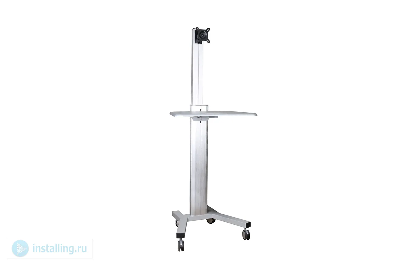 KFT 1601 Silver – напольная мобильная стойка для мониторов 10–24. Высота регулируется: 1450–1760 мм от пола до верхней точки. Встроенный кабель-канал. Наклон: ±45°. Поворот: ±45°. Стандарт VESA 75х75, 100х100. Размеры полки: 640х365 мм (510 мм по ширине в узкой части). Максимальная нагрузка: 20 кг, 10 кг на VESA и 10 кг на полку. Опциональные комплектующие для создания мобильного рабочего места: полка для принтера, системного блока, контейнер для хранения. Материал: алюминий, МДФ, металл. Цвет серебристый.