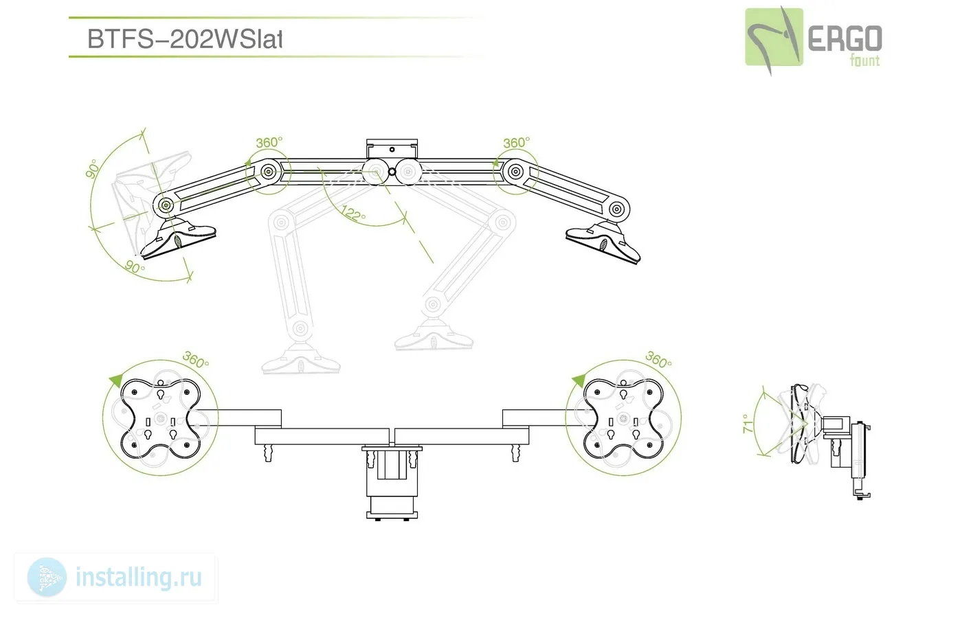 BTFS-202WSlat – шарнирное крепление на офисную перегородку для мониторов диагональю до 24. Стандарт VESA 75х75, 100х100 мм. Количество точек поворота: 3. Количество колен: 2. Вращение: 360°. Наклон: ±35°. Поворот: ±90°. Материал: алюминий, пластиковая декоративная отделка. Максимальная нагрузка: 24 кг.