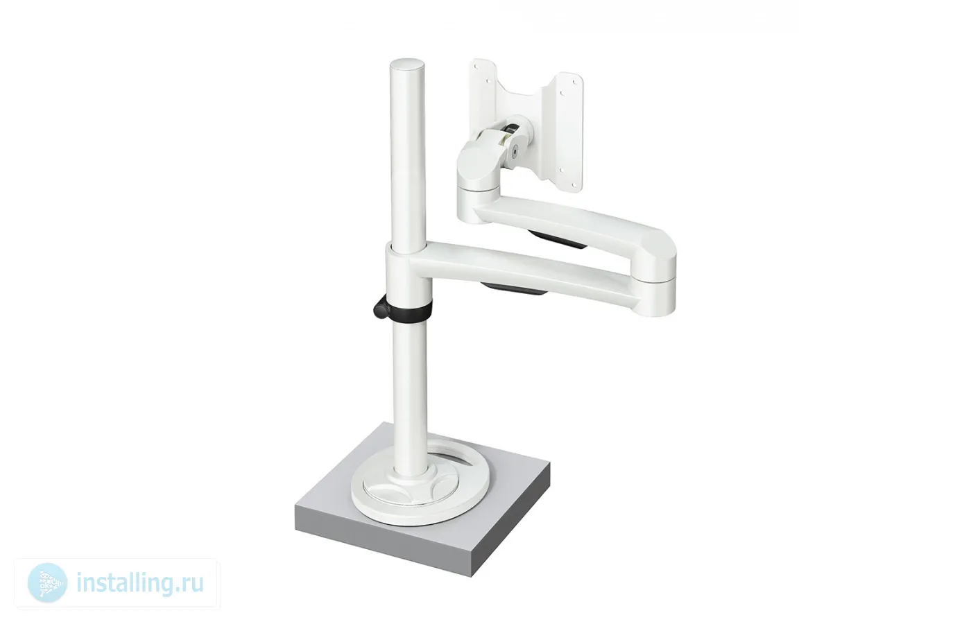 Стандарт VESA 75х75, 100х100 мм. Наклон: ±90°. Вращение: 360°. Вращение VESA: ±180°. Высота: 400 мм. Монтаж к столу: струбцина. Макс. нагрузка 14 кг, струбцина, белый