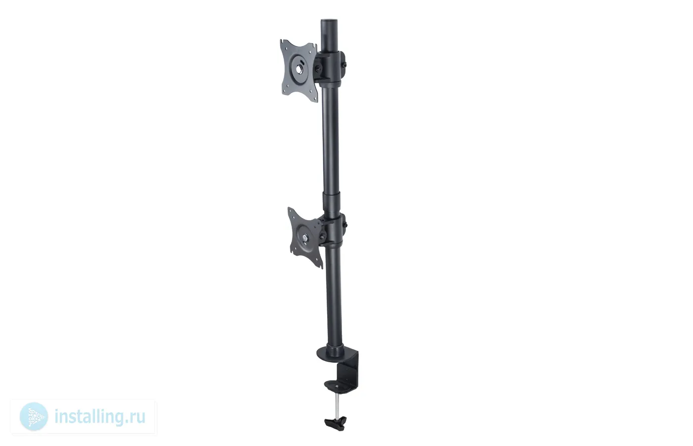 BMMS-02V – настольное шарнирное крепление для 2 мониторов диагональю 13–27. Конфигурация: 2х1. Регулировка высоты в пределах 800 мм. Стандарт VESA 75х75, 100х100 мм. Количество точек поворота: 2. Вращение: 360°. Поворот: ±45°. Наклон: ±45°. Монтаж к столу: струбцина типа G или зажим типа С. Материал: алюминий и сталь. Максимальная нагрузка: 20 кг.