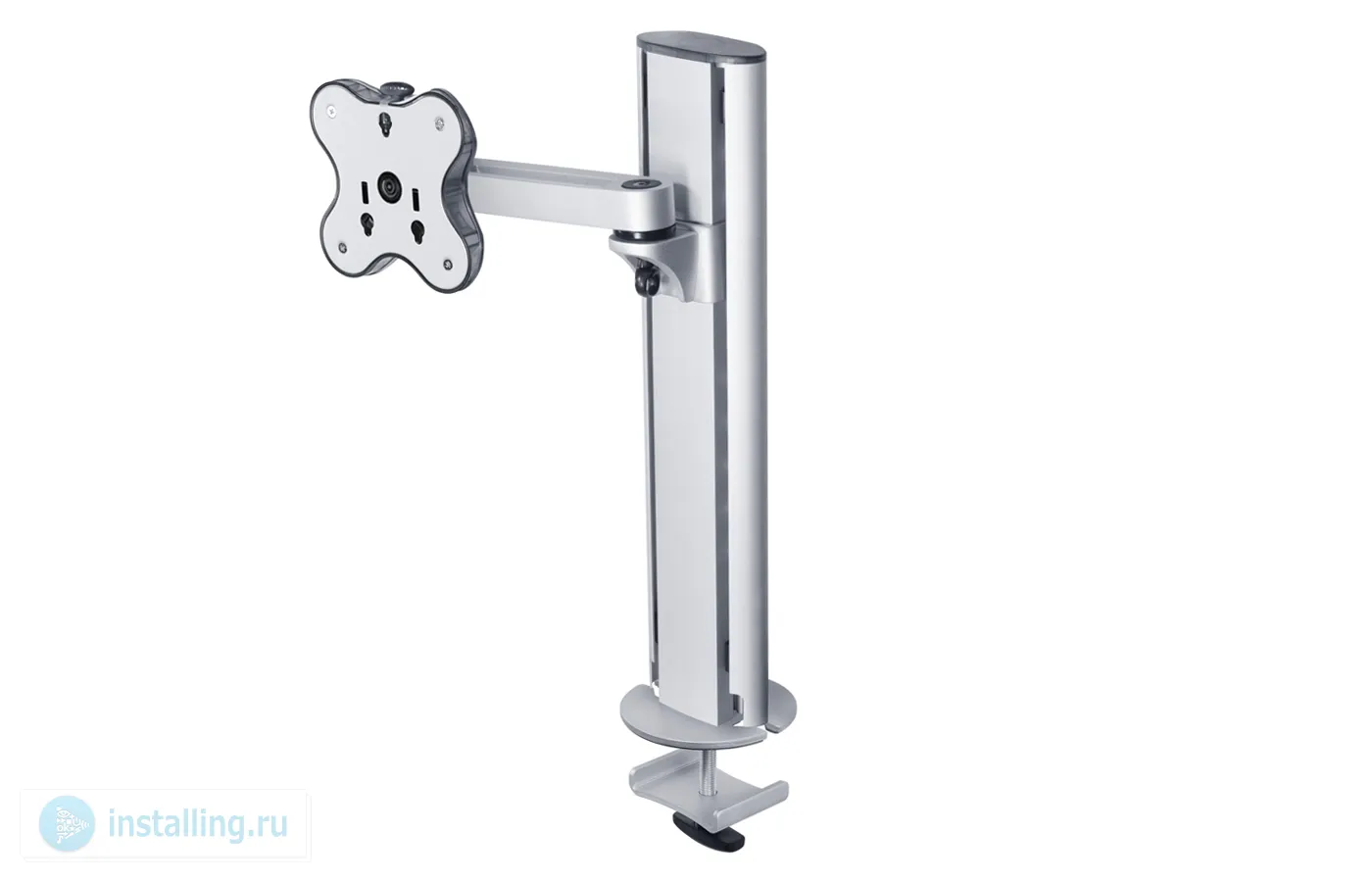 BTFS-101G – настольное шарнирное крепление для монитора диагональю до 24. Регулировка высоты в пределах 450 мм. Стандарт VESA 75х75, 100х100 мм. Количество точек поворота: 2. Количество колен: 1. Вращение: 360°. Наклон: ±30°. Поворот: ±96°. Скрытый кабель-канал в боковых частях вертикальной направляющей. Монтаж к столу: струбцина типа G. Материал: алюминий, пластиковая декоративная отделка. Максимальная нагрузка: 12 кг.