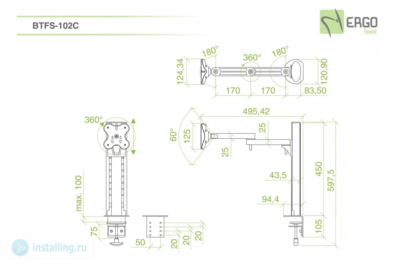 BTFS-102C – настольное шарнирное крепление для монитора диагональю до 24. Регулировка высоты в пределах 450 мм. Стандарт VESA 75х75, 100х100 мм. Количество точек поворота: 3. Количество колен: 2. Вращение: 360°. Наклон: ±30°. Поворот: ±96°. Скрытый кабель-канал в боковых частях вертикальной направляющей. Монтаж к столу: зажим типа C. Материал: алюминий, пластиковая декоративная отделка. Максимальная нагрузка: 12 кг.