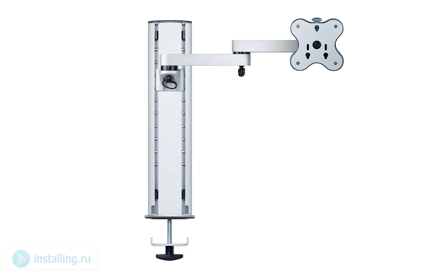 BTFS-102G – настольное шарнирное крепление для монитора диагональю до 24. Регулировка высоты в пределах 450 мм. Стандарт VESA 75х75, 100х100 мм. Количество точек поворота: 3. Количество колен: 2. Вращение: 360°. Наклон: ±30°. Поворот: ±96°. Скрытый кабель-канал в боковых частях вертикальной направляющей. Монтаж к столу: струбцина типа G. Материал: алюминий, пластиковая декоративная отделка. Максимальная нагрузка: 12 кг.