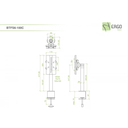 BTFS6-100C – настольное крепление для монитора диагональю до 24. Регулировка высоты в пределах адаптера AS-09X: 150 мм. Стандарт VESA 75х75, 100х100 мм. Вращение: 360°. Наклон: ±30°. Поворот: 360°. Основание: пластина. Монтаж к столу: зажим типа C. Материал: алюминий, пластиковая декоративная отделка. Максимальная нагрузка: 12 кг.