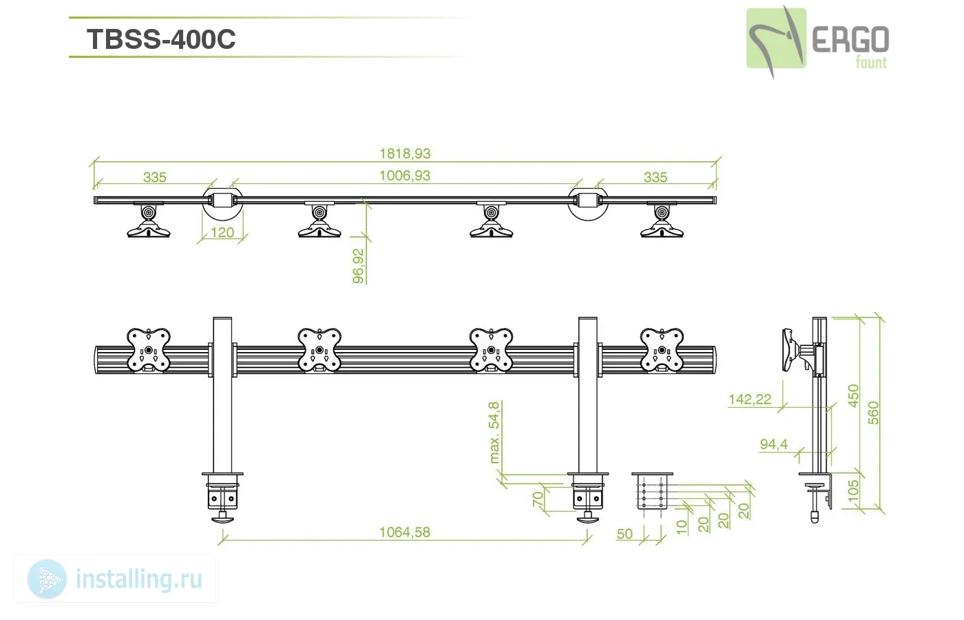 TBSS-400C – настольное крепление для 4 мониторов диагональю до 24. Конфигурация: 1х4. Регулировка высоты в пределах 450 мм. Стандарт VESA 75х75, 100х100 мм. Вращение: 360°. Наклон: ±30°. Монтаж к столу: зажим типа C. Материал: алюминий, пластиковая декоративная отделка. Максимальная нагрузка: 48 кг.