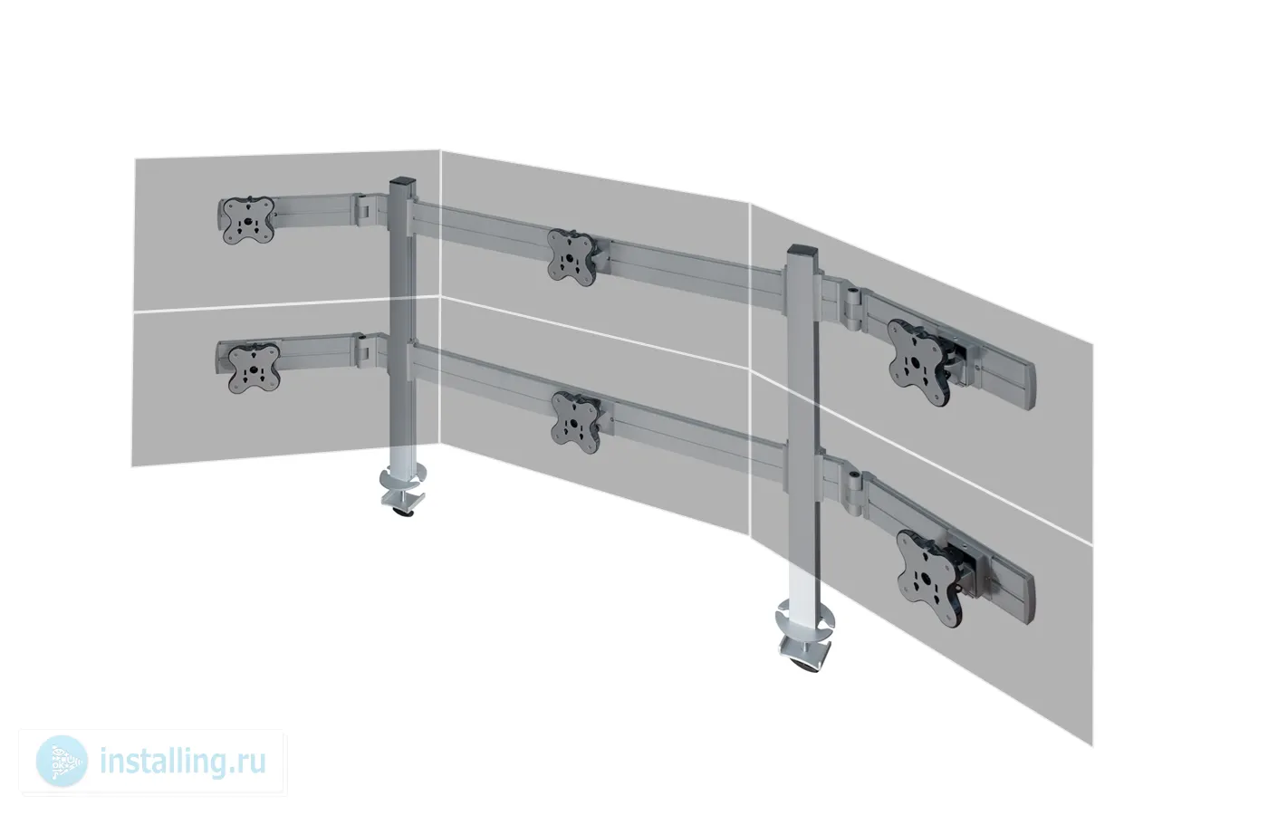 TBSS-600WG – настольное крепление для 6 мониторов диагональю до 24. Конфигурация: 2х3. Поворотные боковые планки. Регулировка высоты в пределах 800 мм. Стандарт VESA 75х75, 100х100 мм. Вращение: 360°. Наклон: ±30°. Монтаж к столу: струбцина типа G. Материал: алюминий, пластиковая декоративная отделка. Максимальная нагрузка: 72 кг.