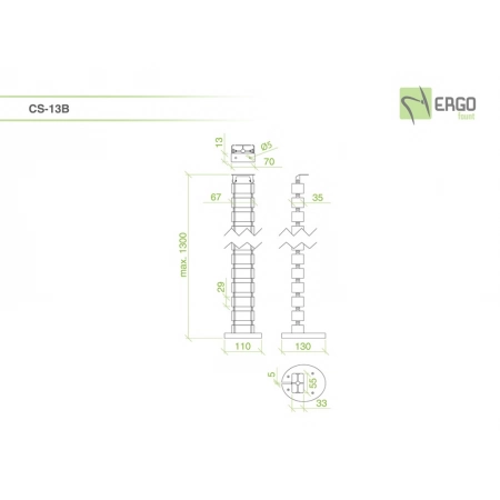CS-13B – гибкий пластиковый кабель-канал для стола, крепится к нижней стороне столешницы. Кабельная цепь из 30 блоков. Полуоткрытый. Длина: 1300 мм. Ширина: 67 мм. Материал: АБС-пластик, основание металлическое. Цвет черный.