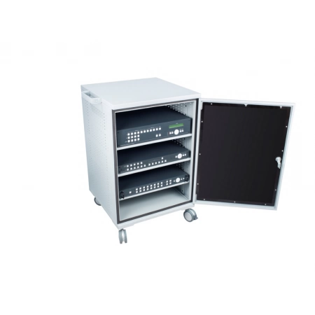 3 полки для размещения устройств, место для установки розетки и вывода провода. Боковая ручка для перемещения. 2 двери, фронтальная – из оргстекла. Макс. нагрузка 60 кг, серебристая