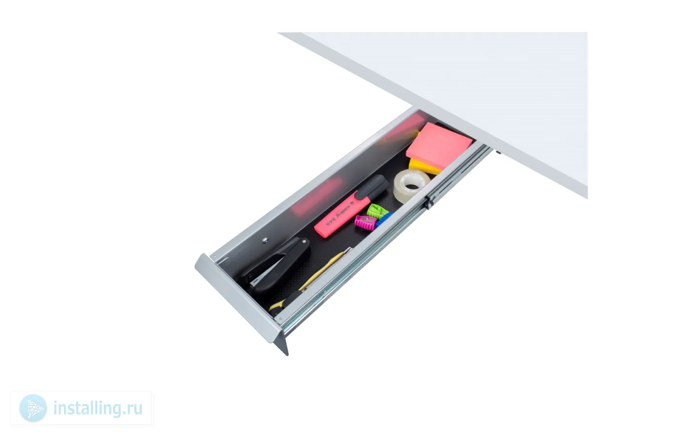 PT1445S – узкий выдвижной ящик-органайзер для канцелярских принадлежностей, крепится под столешницей. Компактная конструкция высотой 75 мм. Одно отделение, полезное пространство (ШxГxВ): 103x439x63 мм. Нескользящая подложка на дне. Телескопические направляющие с плавным ходом. Материал: металл, пластик. Цвет серебристый.